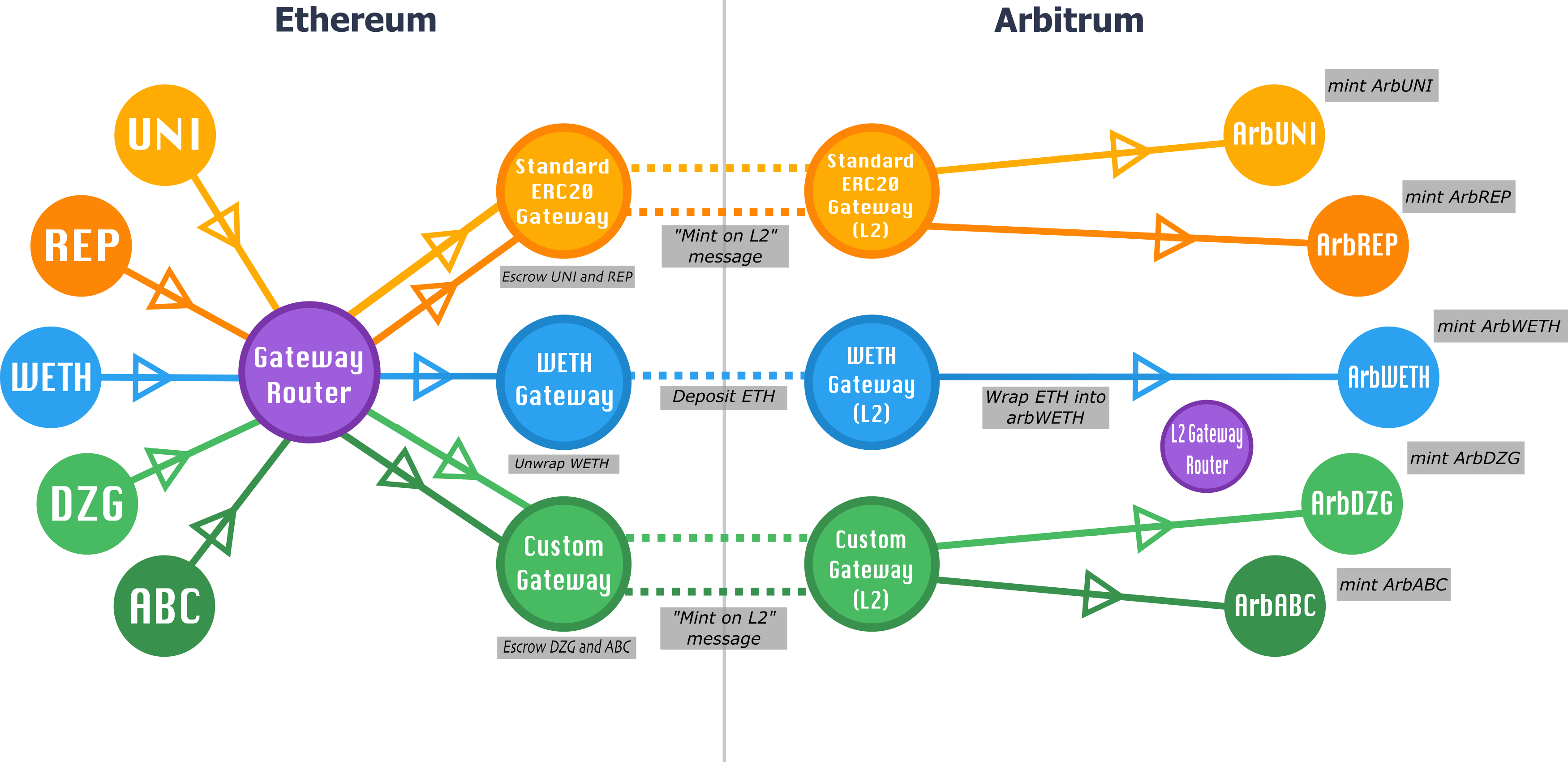 - Routers: Exactly two contracts (one on the parent chain, one on the child chain) that route each asset to its designated gateway.